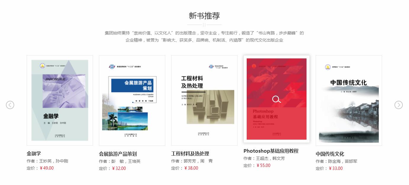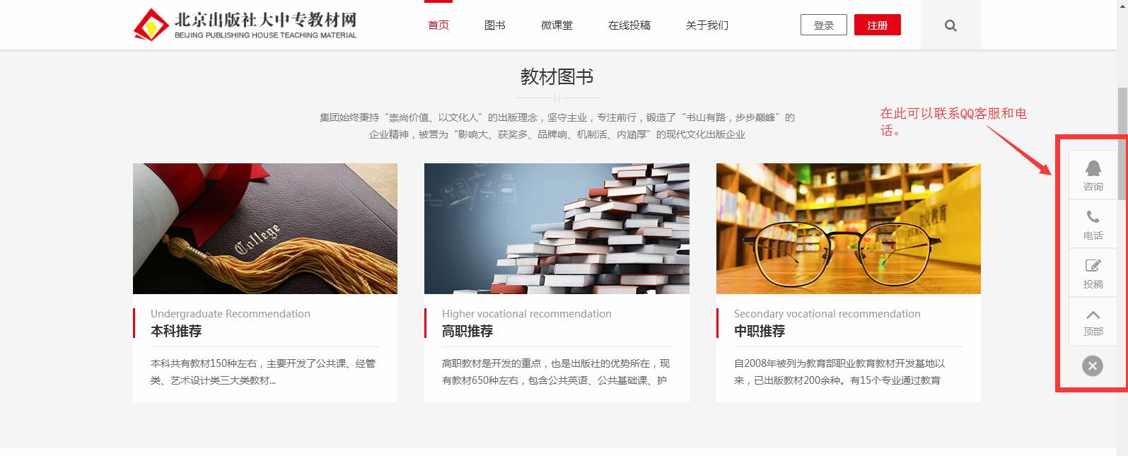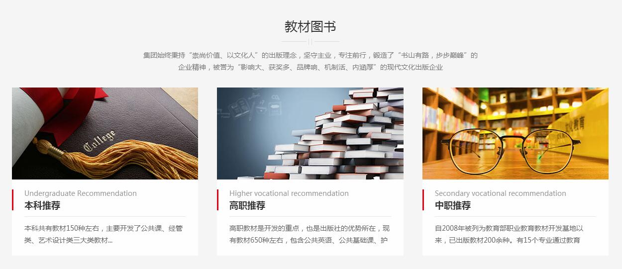 教材图书:主要是用来区分教材的级别分类:本科教材、高职教材、中职教材三个级别。通过三个入口可以进入分别的分类中的所有专业教材展示页面。