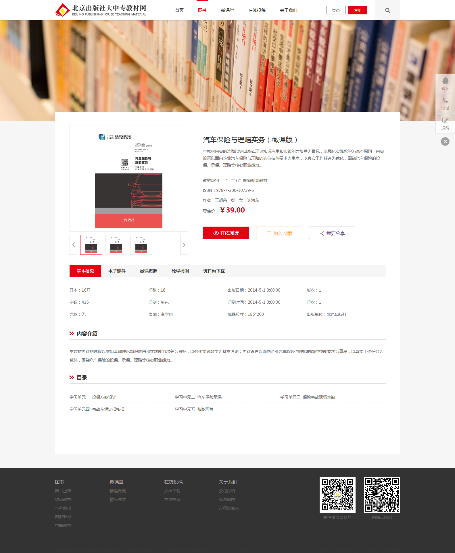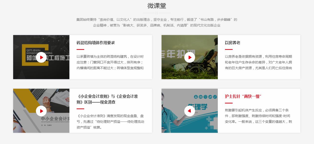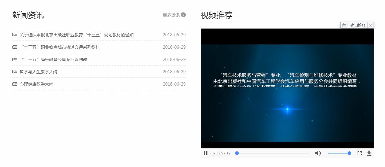 页面的设计以简约大方,清晰明了为主,首页中主要有教材图书、新书推荐、微课堂、新闻资询和视频推荐。