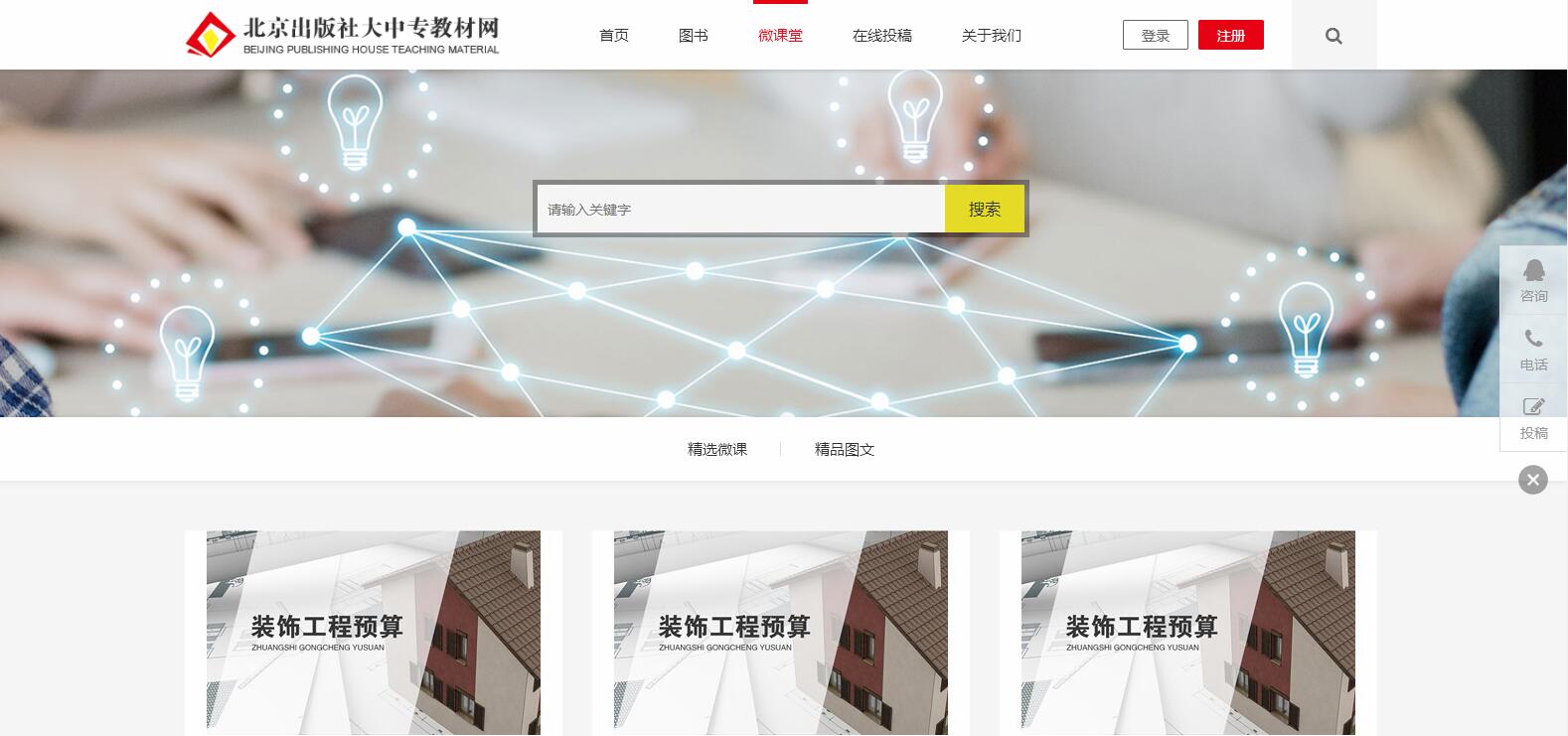 微课学是本次网站改版后的新增模块,在这里展示的是我们所出的二维码教材中的二维码内容资源,如下图。在这一页我们可以通过搜索书名或二维码名称进行查询某一本书或是某一二维码的内容。精选微课和精品图文标签中分别展示着所有的微课视频和图文内容。由于版权问题,我们的微课堂中的视频只能在线观看,不能下载存储,所以大家关于此问题也就不用在找客服咨询此问题了,还请大家见谅。