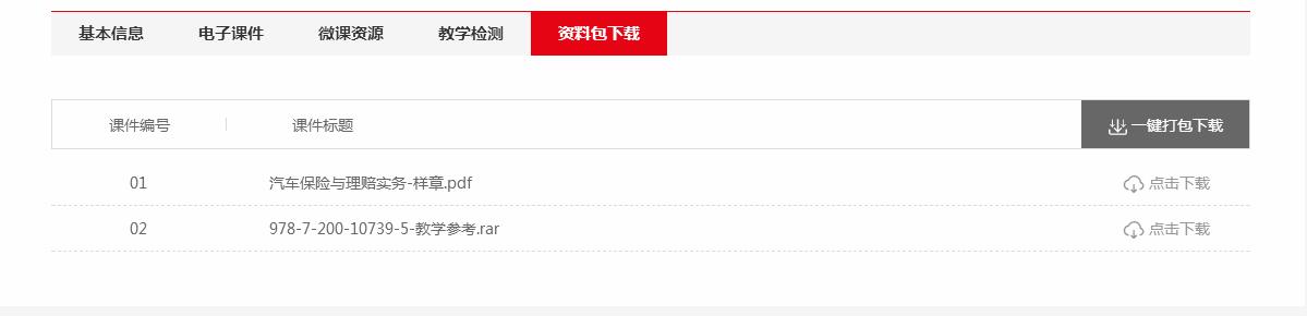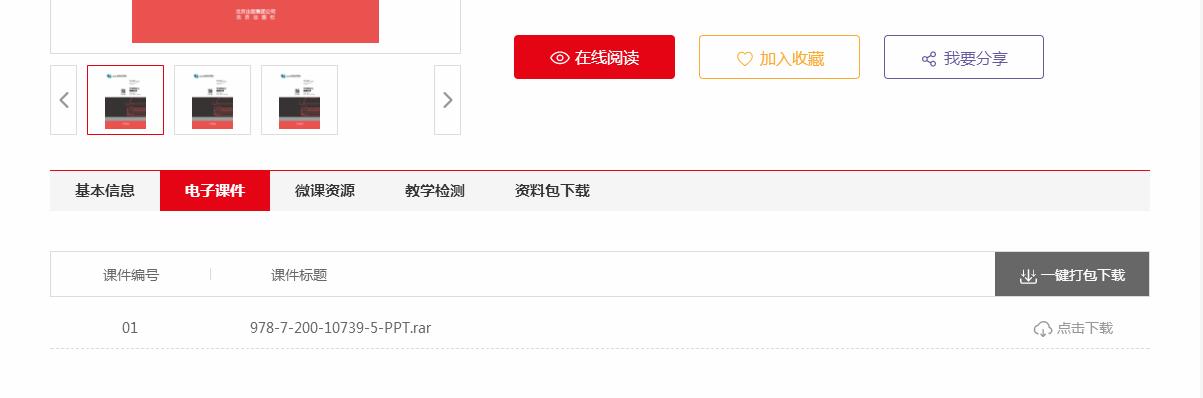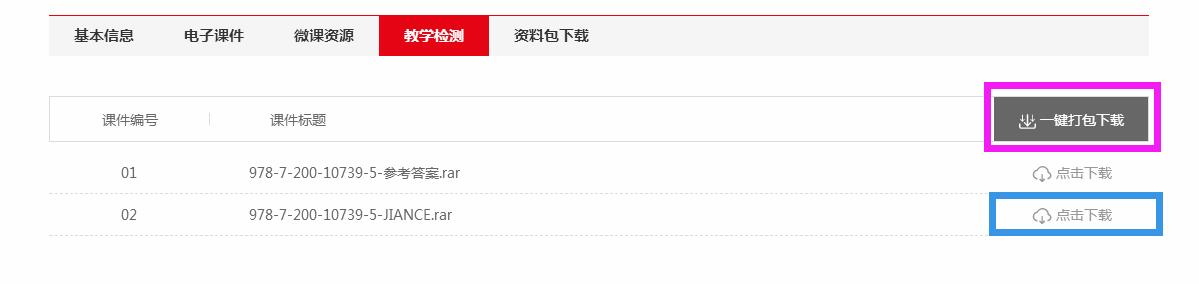 针对以上的下载在此说明一下:上图中紫色框的“一键打包下载”是指下载该项中的所以内容,这个使用起来下载会很慢,如果这个使用觉得不方便的大家可以选择用蓝色框的“点击下载”,点击下载是分别下载对应的每个编号对应的内容,这个下载起来会快很多。电子课件标签选项中有些书我们为了方便在线查看课件我们上传了PPT的文件,这个只适用在线查看,下载的话可以选择压缩包的下载。