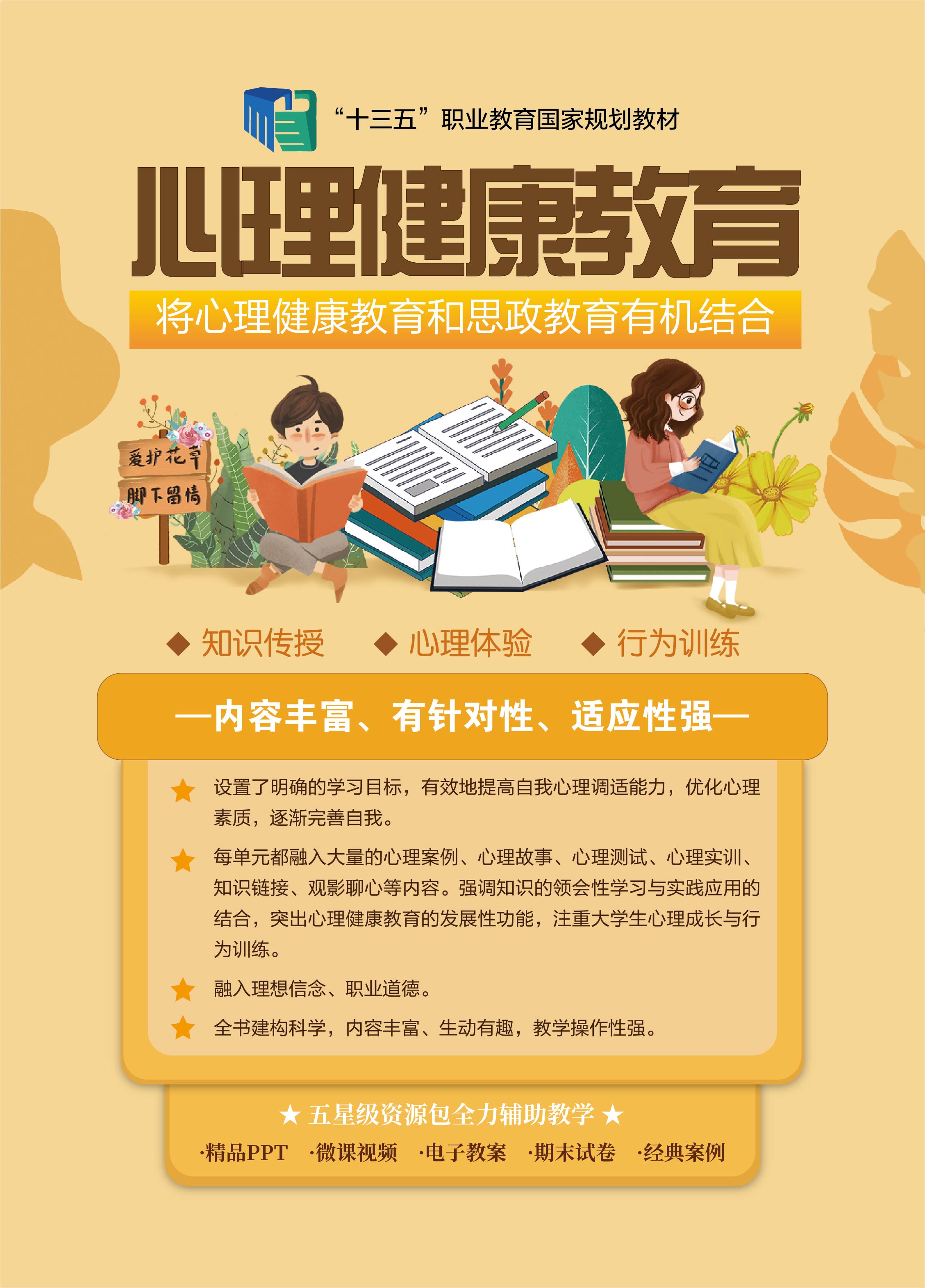 为了能够帮助高职高专学生更加直观、准确地去了解心理健康、了解自我,进而有效地提高自我心理调适能力,优化心理素质,逐渐完善自我,本书每单元都设置了明确的学习目标,每单元都融入大量的心理案例、心理故事、心理测试、心理实训、知识链接、观影聊心等内容,配套资源丰富,每单元都配有教学短视频、微课、动画等转化为二维码的信息化技术内容的补充,强调知识的领会性学习与实践应用的结合,突出心理健康教育的发展性功能,注重大学生心理成长与行为训练。全书建构科学,内容丰富、生动有趣,教学操作性强。