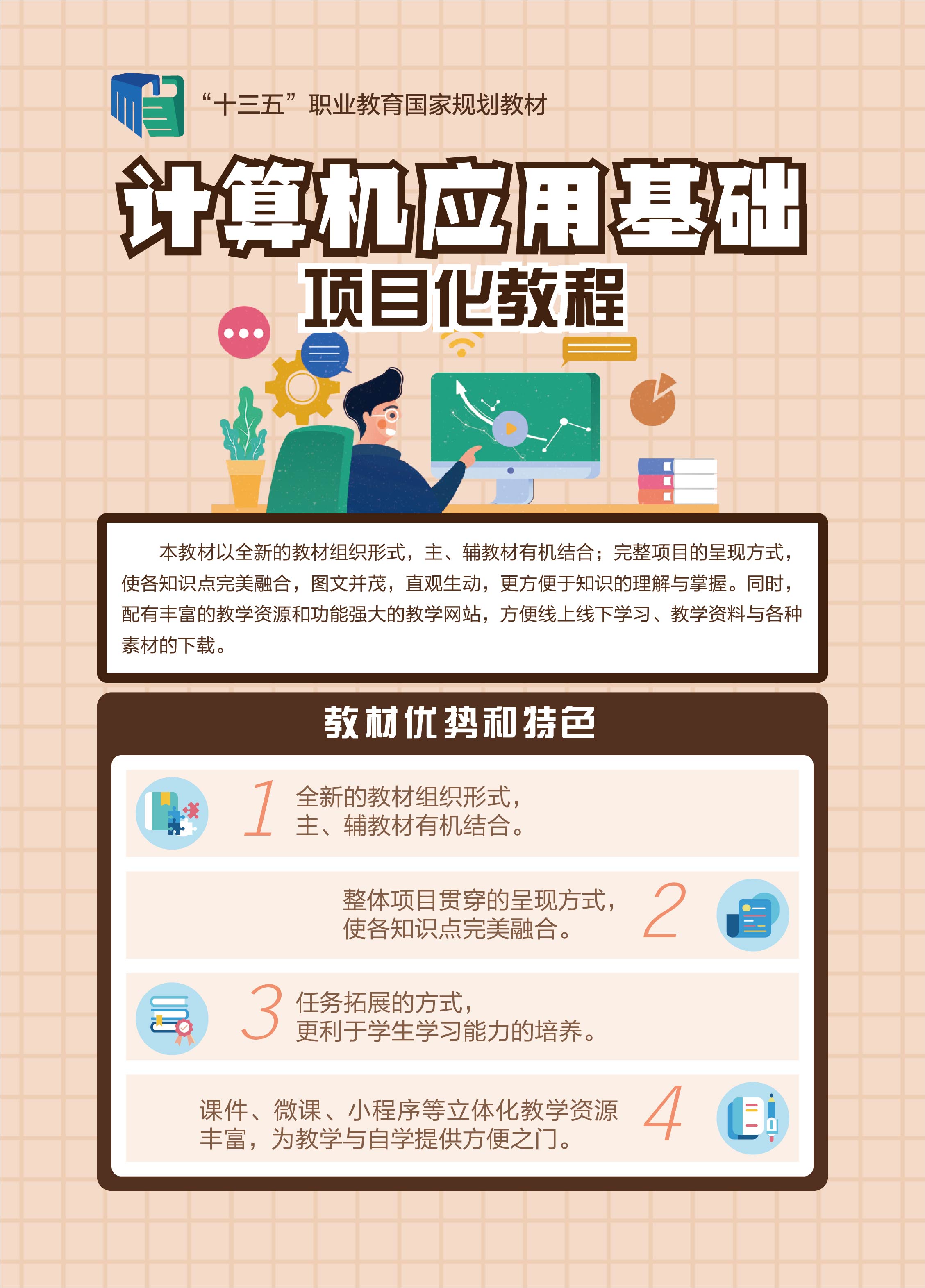 本套教材共两册,《计算机应用基础项目化教程》是主教材。主教材以模块化的形式组织教学内容,以完整的项目为载体,将应该掌握的基本技能融入精心挑选的学习和生活中的真实项目中,然后以工作过程为导向,将项目分解为若干个任务,以任务驱动教学。