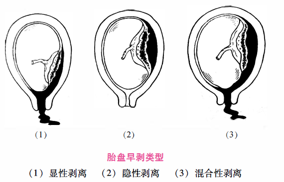 胎盘早剥分为显性剥离、隐性剥离和混合性3种类型。其主要的病理变化是底蜕膜出血,形成胎盘后血肿,促使胎盘自附着部剥离。若剥离面小,出血量少,则血液很快凝固,临床无症状。若剥离面大,出血多形成胎盘后血肿,使剥离部分更加扩大,从而出血更多。当血液冲开胎盘边缘,沿胎盘及子宫壁之间经宫颈管向外流出,为显性出血或外出血。若胎头仍附着于子宫壁上,或胎儿头部已固定于骨盆入口,使胎盘后血液不能流出,积聚于胎盘与子宫壁之间,为隐性出血或内出血。胎盘后积血越来越多,子宫底随之上升。当内出血量过多时,血液仍会冲开胎盘边缘,向子宫颈口外流,形成混合性出血。有时,血液会穿破羊膜而溢入羊水中,则羊水变成血性。