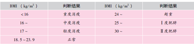 (2)体质指数(BMI):是目前评价机体营养状况及肥胖度最常用的指标。BMI=体重(kg)/身高(m)2,判断标准如表4-1所示。理想值介于18.5~23.9之间,<18.5为消瘦,≥24为超重。