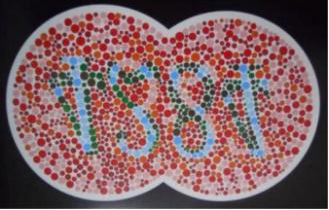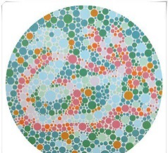 色盲又分为许多类型,仅对一种原色缺乏辨别力者,称为单色盲,如红色盲,又称第一色盲,比较多见;绿色盲,称为第二色盲,比第一色盲少些;蓝色盲,即第三色盲,比较少见。对两种原色缺乏辨别力者,称为全色盲,较为罕见。色盲多为先天性遗传所致,少数为视路传导系统障碍所致。一般是女性传递,男性表现。根据统计,男性色盲发病率为5%,而女性则为1%。有先天性色觉障碍者,往往不知其有辨色力异常,多为他人觉察或体检时发现。凡从事交通运输、美术、化学、医药等工作的人员必须有正常的色觉,因此,色觉检查就成为服兵役、就业、入学前体检时的常规项目。下图就是一些常见的色盲检查图,有正常色觉的人可以看清楚图片中的数字和物体,而色盲则无法辨别出图形里面的数字和物体。