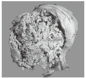 1. 肉眼观察 见大部分纤细分支的绒毛水肿,形成大量成串的半透明水泡;病变局限于子宫腔内,不侵入肌层。内含清亮液体,有蒂相连,状似葡萄(如图)。如果所有绒毛均呈葡萄状,称为完全性葡萄胎。部分绒毛呈葡萄状,仍保留部分正常绒毛,伴有或不伴有胎儿或其附属器官者,称为不完全性或部分性葡萄胎。绝大多数葡萄胎发生于子宫内,个别患者也可发生在子宫外异位妊娠的所在部位。