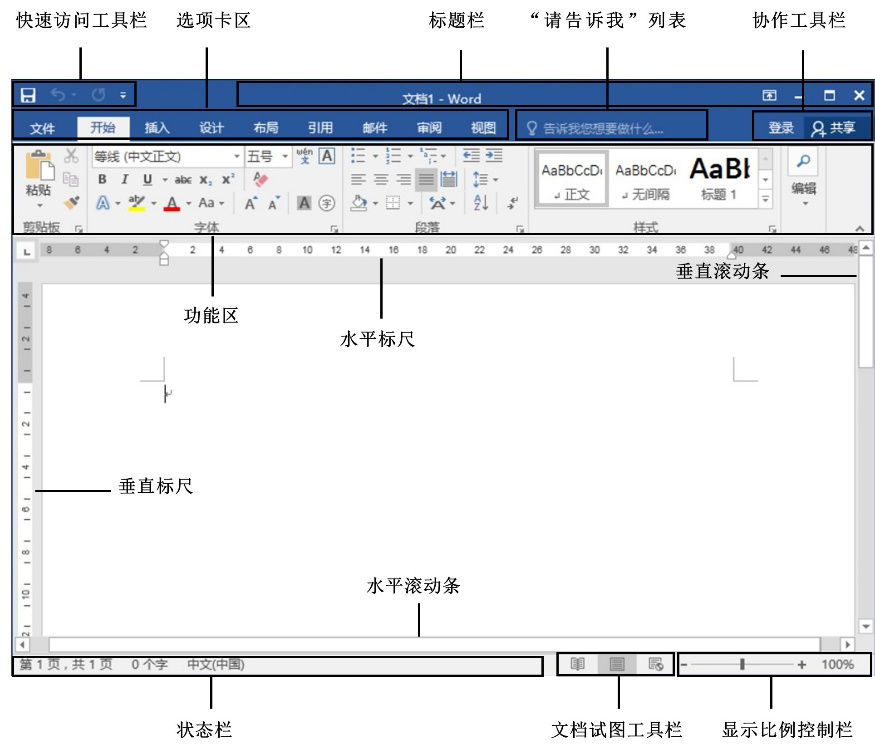 Word窗口由标题栏、快速访问工具栏、选项卡区、工作区、状态栏、文档视图工具栏、显示比例控制栏、标尺、滚动条,以及帮助、登录和共享按钮等部分组成。在Word窗口的工作区中可以对创建或打开的文档进行编辑、排版操作。Word窗口组成如图1所示。