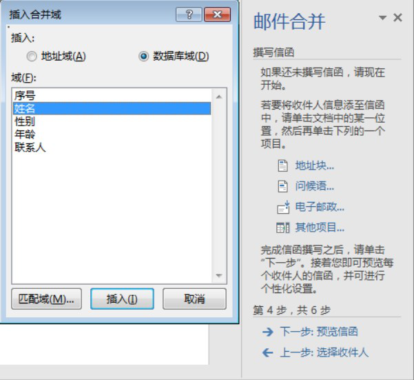 ⑦确定了数据源之后,单击“下一步:撰写信函”超链接,进入“邮件合并分步向导”的第4步。对主文档进行编辑修改,并通过插入合并域的方式向主文档中适当的位置插入数据源中的信息。单击“其他项目”超链接可打开“插入合并域”对话框(图4)。