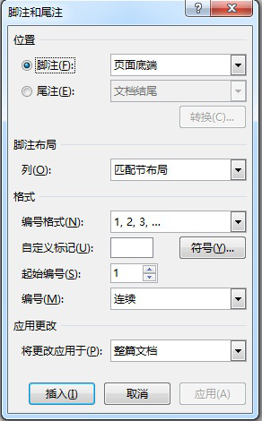 ④单击“脚注”选项组右下角的“对话框启动器”按钮,打开“脚注和尾注”对话框,可对脚注或尾注的位置、格式及应用范围等进行设置(图6)。