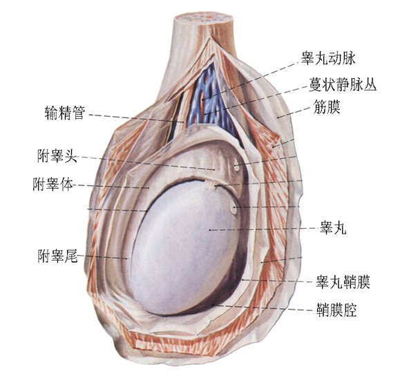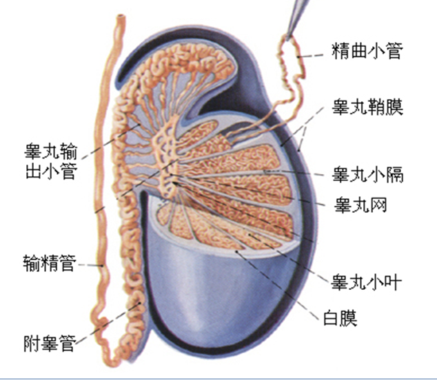 睾丸属男性内生殖器官。正常有两个睾丸,分别位于左右阴囊内。睾丸呈卵圆形,色灰白。成人睾丸长3.5-4.5厘米,宽2-3厘米,厚1-2厘米,每侧睾丸重10-15克。睾丸表面有一层坚厚的纤维膜,称为白膜,沿睾丸后缘白膜增厚,凸入睾丸内形成睾丸纵隔。从纵隔发出许多结缔组织小隔,将睾丸实质分成许多睾丸小叶。睾丸小叶内含有盘曲的精曲小管,精曲小管的上皮能产生精子,一次射精3-4毫升,含有3-4亿个精子。小管之间的结缔组织内有分泌男性激素的间质细胞。精曲小管结合成精直小管,进入睾丸纵隔交织成睾丸网。从睾丸网发出12~15条睾丸输出小管,出睾丸后缘的上部进入附睾。