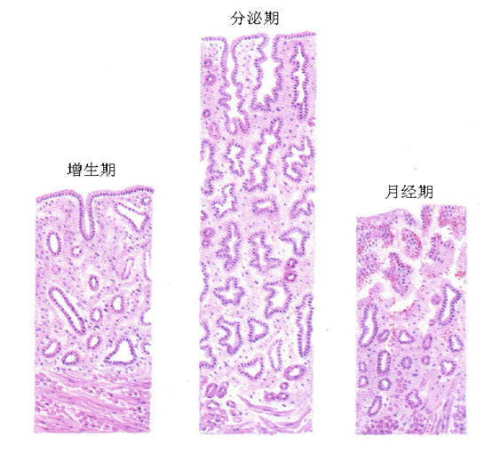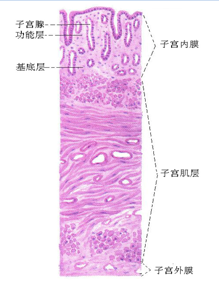 子宫内膜是指构成哺乳类子宫内壁的一层。子宫内膜对雌激素和孕激素都起反应,因此可随着性周期$2发情周期、月经周期$3发生显著的变化,可分为月经期,增殖期和分泌期。雌激素可引起子宫肥大,孕激素可促使子宫内膜发生特殊的妊娠初期变化,或改变子宫内膜的性质,使之具有产生蜕膜的能力。子宫内膜覆盖着粘膜,由粘膜上皮与其下方的固有层所组成。粘膜上皮为柱状上皮、立方上皮或复层柱状上皮,雌激素分泌时,各上皮细胞将长大、分裂使数目增多。固有层中粘膜上皮下方的部分称为机能层,上皮细胞进入其中形成子宫腺,并对雌激素起反应。机能层的下层称为基底层,富有血管。