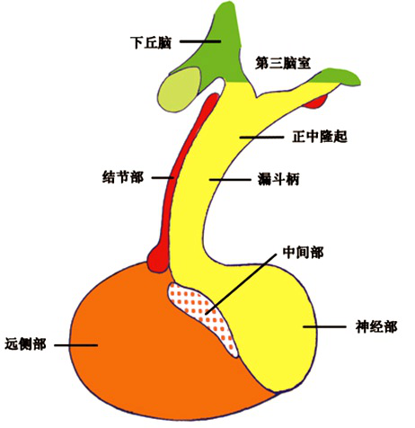 垂体是重要的内分泌腺体,位于颅底蝶鞍的垂体窝内,呈椭圆形,灰红色,成年男性垂体重0.35g~0.80g,女性重0.45g~0.90g。垂体由腺垂体和神经垂体两部分构成。