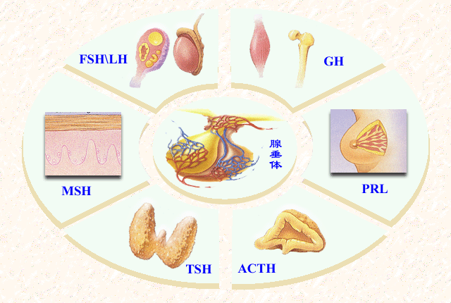腺垂体包括远侧部、结节部和中间部。分泌①生长激素(GH),分泌不足可导致 “垂体侏儒症”;分泌过多,则引起“巨人症”。在成人分泌过多,可出现 “肢端肥大症”。②催乳激素(PRL)能促进乳腺发育和乳汁分泌。③促甲状腺激素(TSH),能促进甲状腺滤泡上皮细胞增生及甲状腺激素的合成和释放。④促肾上腺皮质激素(ACTH),促进肾上腺皮质分泌糖皮质激素。⑤卵泡刺激素(FSH)和黄体生成素(LH),卵泡刺激素在女性促进卵泡的发育,在男性刺激生精小管支持细胞合成雄激素结合蛋白,促进精子的发生。黄体生成素在女性促进卵巢排卵和黄体形成,在男性刺激睾丸间质细胞分泌雄激素,因此又称间质细胞刺激素.