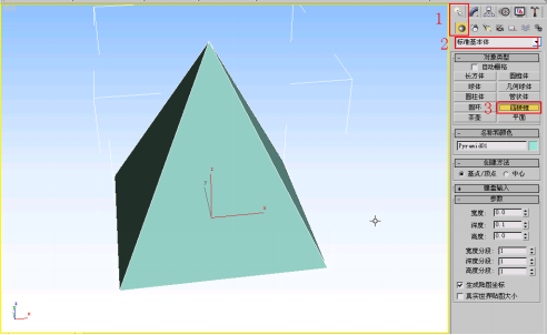 创建方法是:先按如下步骤选择好创建命令,在屏幕上按住鼠标左键拖动鼠标,建立四棱锥的底面,再松开鼠标移动,创建出四棱锥的高,在合适的时候单击鼠标,确定完成四棱锥的创建。如图4.2.4所示。