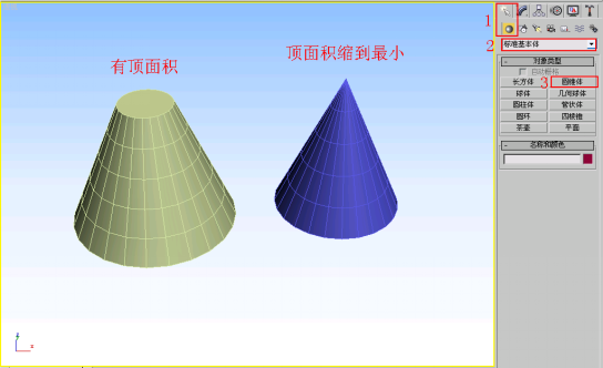 创建方法是:先按如下步骤选择好创建命令,在屏幕上拖动鼠标,创建出圆锥体的底面,第二步松开鼠标,移动,创建出圆锥体的高度,点击确定,第三步就是在松开鼠标的情况下移动生成圆锥体的顶面。如图4.2.6所示。