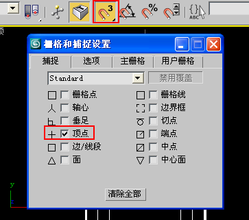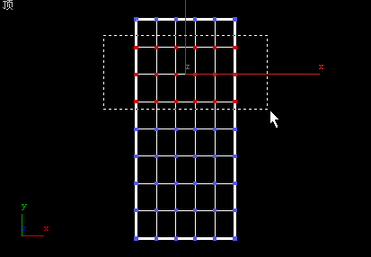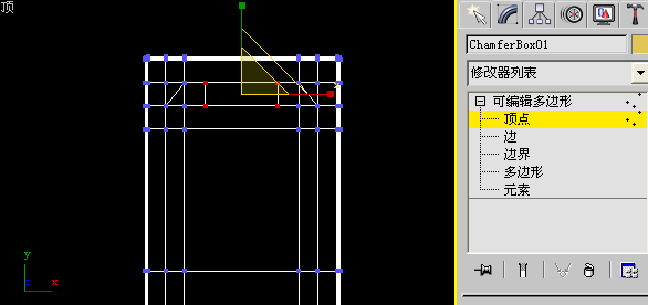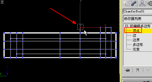 要想在模型上面表现出更多的细节,就要在模型表面上划分更多的表面。进入修改器堆栈中的“顶点”级别,在顶视图中调节各顶点的位置,首先用框选的方式选如图4.4.97所示的顶点。
