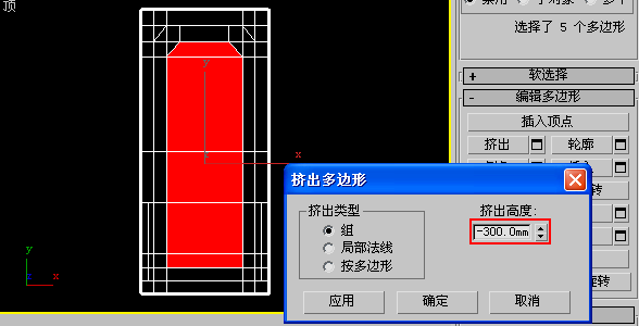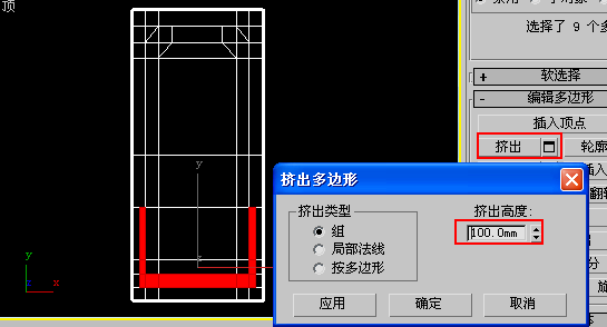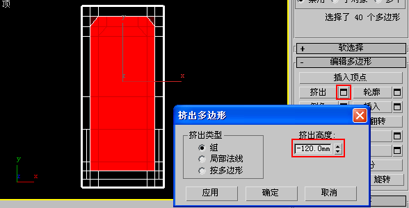 进入多边形层级,选择如下的表面,单击挤出按钮右侧的复选框,设置挤出值为-120mm,如图4.4.112所示。