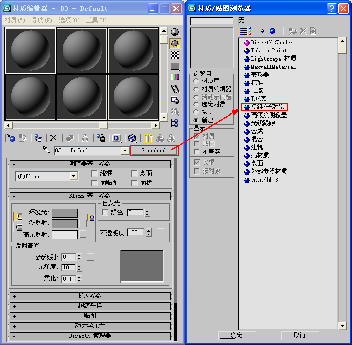 单击按钮,从中选择“多维子对象”材质类型,如图4.4.128所示。
