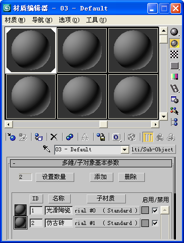 把这个多维子对象材质指定给浴缸物体,在选择浴缸的情况下,单击按钮。下面我们就分别来编辑ID为1的光滑陶瓷材质和ID为2的仿古砖材质。如图4.4.131所示。