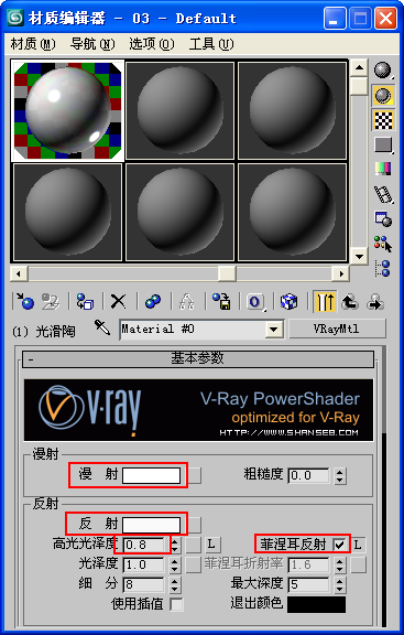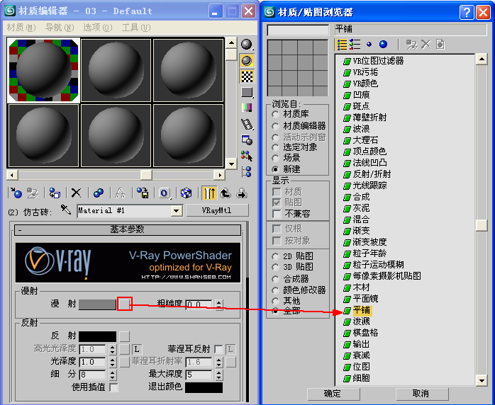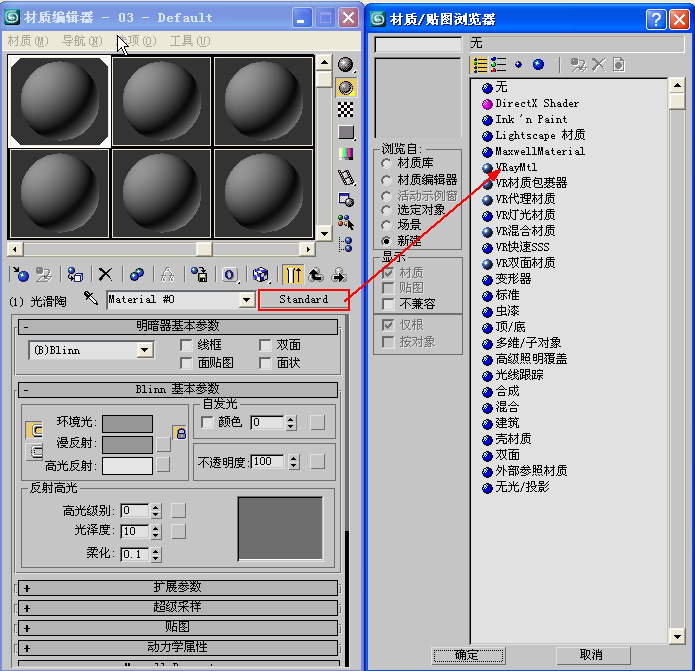 关闭渲染场景对话框,这个时候,我们就可以在材质编辑器中选择VRayMtl了,如图4.4.135所示。