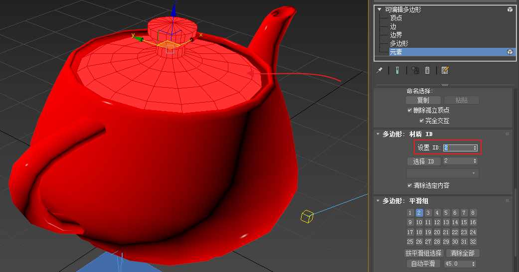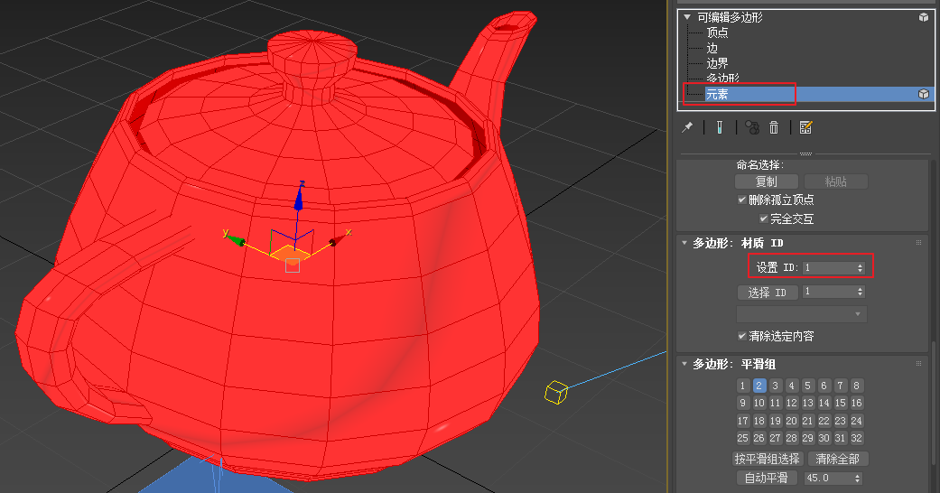 进入多边形物体的元素层级,选择所有的元素,在修改命令面板,设置材质ID号为1。如图5.4.29所示。