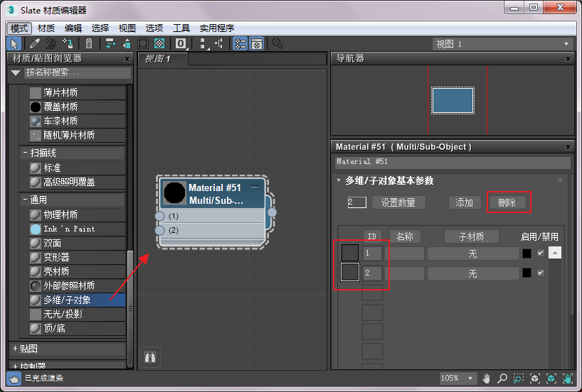 按M键,打开材质编辑器,建立一个多维/子对象材质,并按“删除”键,保留2个数量的材质就可以了。如图5.4.31所示。