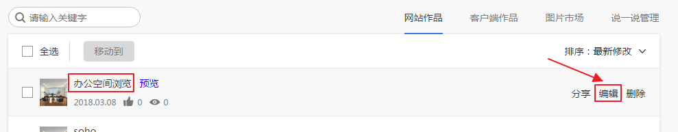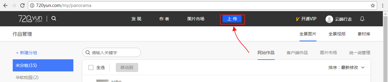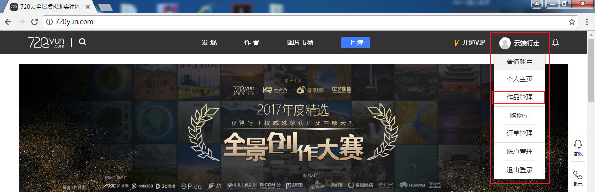 下面以在720云上面发布作品为例进行讲解。首先进入网站720yun.com,注册一个账号,并登陆。点击“作品管理”,如图9.3.1所示。