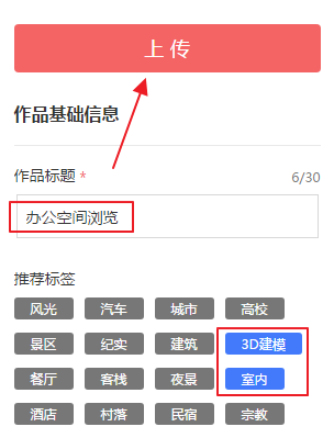 在右侧输入作品基础信息,写上作品标题,也可以自己写上一些标签。再点击上传。如图9.3.5所示。