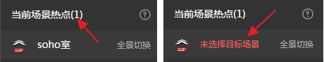 用同样的方法在“会议室”全景中设置一个热点,切换到“soho室”。设置完成后,会显示该场景的热点的个数,如果有热点忘记设置目标场景了,也会有提示。如图9.3.15所示。