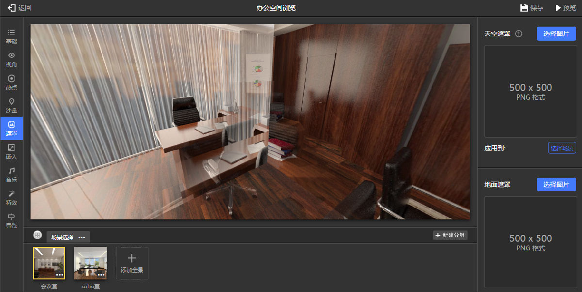 添加天空和地面遮罩,可以起到展示或遮挡部分瑕疵的功能。该添加功能一般用得不太多,使用起来也很简单,只要上传图片就可以了。如图9.3.17所示。