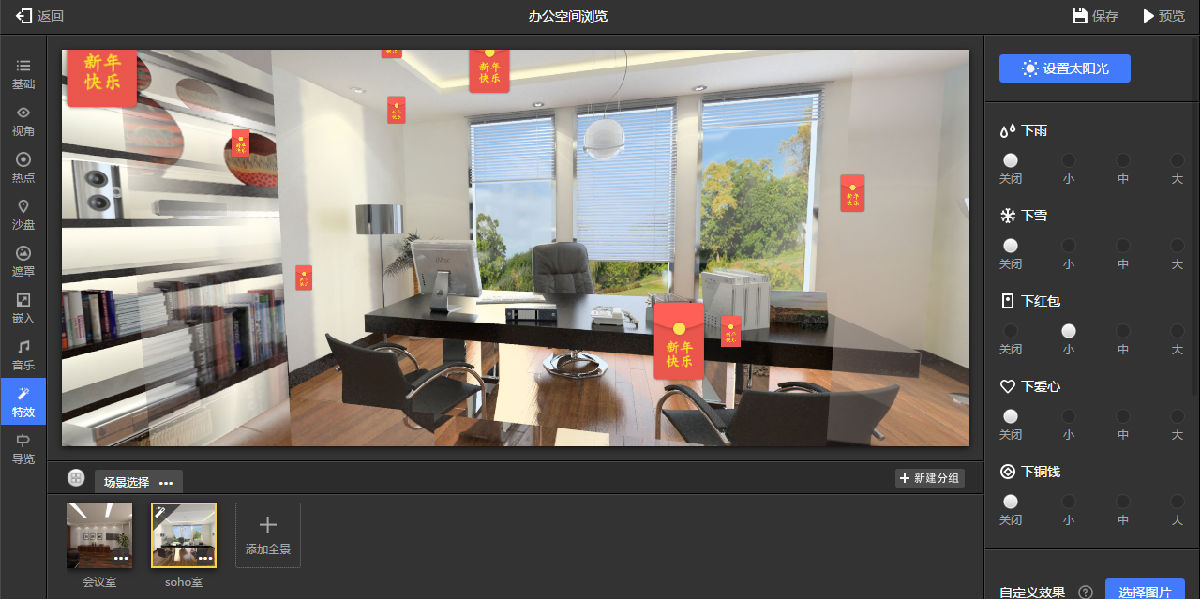 特效选项板中可以设置全景的下雨、下雪、下红包等的特殊效果。如图9.3.20所示。
