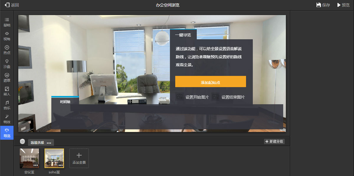 一键导览功能,如图9.3.21所示。类似于设置好了路径,不需要操作,一路展示下去。设置完成后,点击保存,就可以预览了。如果觉得还需要改动的话,可以随时更改。