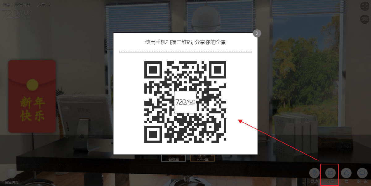 查看自己的全景作品,点击分享,弹出一张二维码图片,如图9.3.22所示。点击鼠标右键可以保存这张图片并发送给别人。通过扫描二维码可以随时随地观看全景作品。
