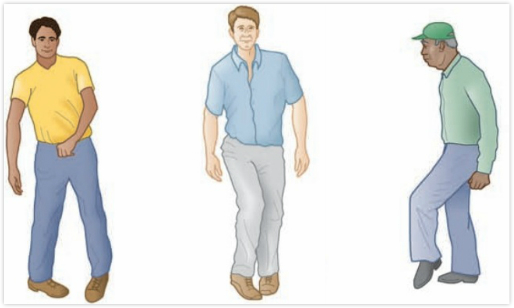 图中依次展示了偏瘫步态、剪刀步态和胫前肌无力步态。