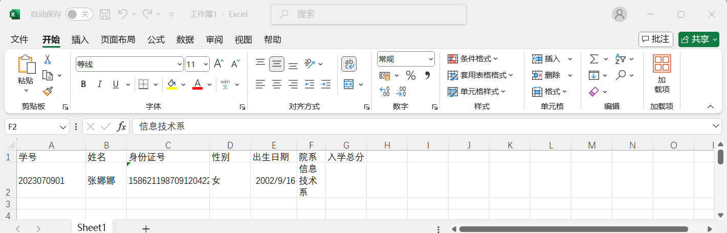 F2单元格中的汉字“信息技术系”没有全部显示的原因是F列宽度不够,此时可以加大F列的宽度;也可以单击“开始”选项卡中的“对齐方式”选项组中的“自动换行”按钮,其内容将分在三行显示,如图1所示。