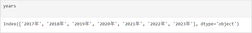 data.columns[1:] 表示DataFrame data的所有列名,从第二列开始到最后一列。data.columns 返回 DataFrame 的所有列名,是一个 Index 对象。[1:] 是切片操作,从索引 1 开始(即第二列),取到最后一个列名。此操作输出的结果存储到years中,years的结果如图2所示。