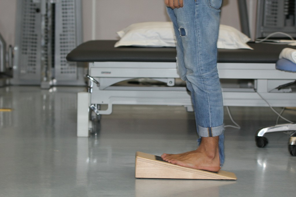 此训练的目的是让患者自行完成跟腱及小腿三头肌的牵伸。要求患者双足并拢站立于楔形板上,足跟不能抬起。治疗师可根据患者病情,调节楔形板倾斜的角度。