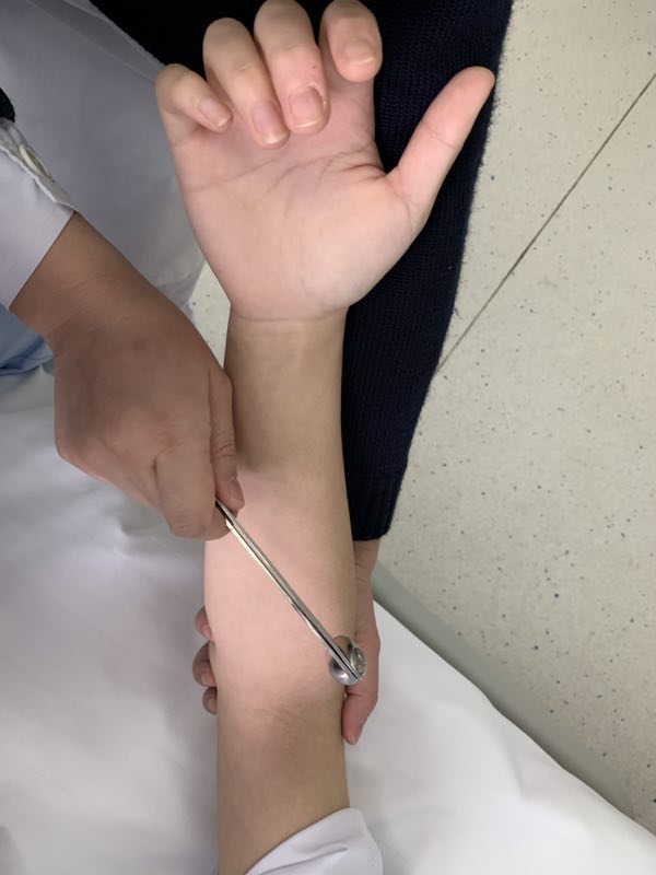 检查方法:检查者以左手托扶病人屈曲的肘部,并将拇指置于肱二头肌肌腱上,然后以叩诊锤叩击拇指,正常反应为肱二头肌收缩,前臂快速屈曲。反射中枢在颈髓5~6节。