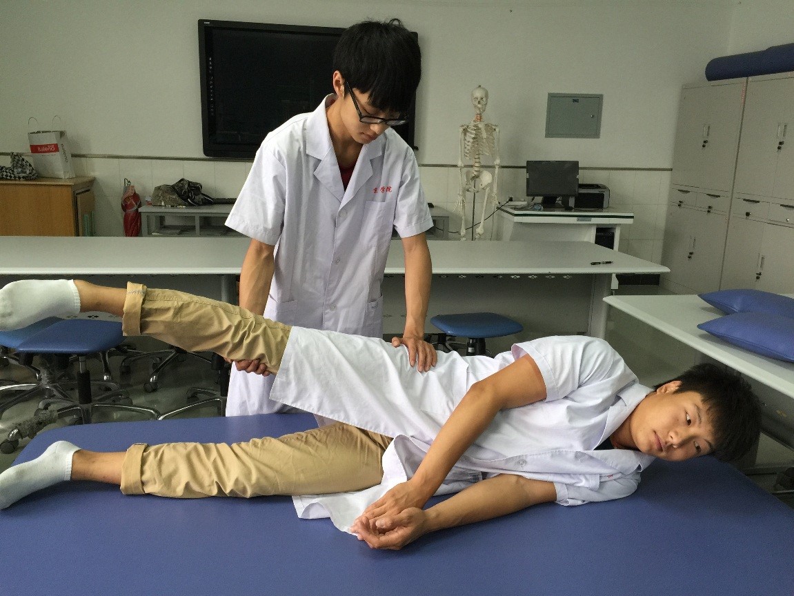 图4-56髋关节内收肌群5级、4级肌力检查方法