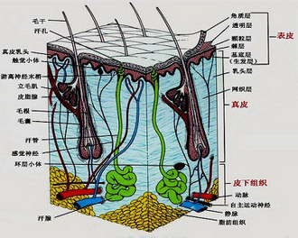 表皮是皮肤的最外一层,由角化的复层扁平上皮构成,不含血管和淋巴管,但有丰富的游离神经末梢。从基底到表面可分为5层:基底层、棘层、颗粒层、透明层、角质层。基底层有较强的分裂增生能力,新生细胞可向浅层推移,转化成其余四层的细胞。基底细胞之间有少黑色素细胞,能产生黑色素,黑色素多少决定皮肤的颜色,并能吸收和散射紫外线,保护皮肤免受辐射损伤。角质层为表皮的表层,由多层扁平的角质细胞组成,起保护作用。