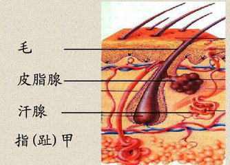 人体皮肤除手掌和足底等处外,均有毛发发布。分为毛干和毛根两部分,露于皮肤外面的部分叫毛干;毛根埋在皮肤内,周围包有毛囊。毛囊由上皮和结缔组织构成,毛根和毛囊下端膨大,称毛球,其对体毛的生长有重要的作用。毛球是毛的生长点。毛囊一侧附有斜行平滑肌束,称竖毛肌,受交感神经支配,收缩时,可使毛发竖直,皮肤发生“鸡皮疙瘩”。