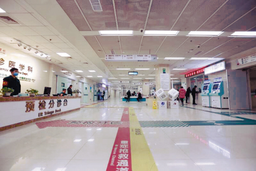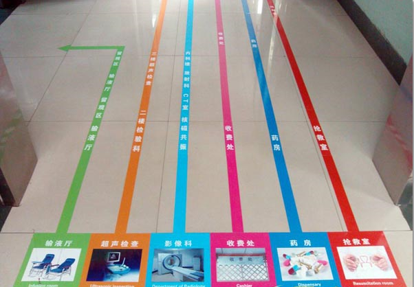 急诊科门外有醒目的路标,可以使急诊患者迅速找到急诊科的所在位置,急诊科内也有明显的标识,方便和引导患者就诊,与手术室、重症医学科等相连接的院内紧急救治绿色通道标识清楚明显。地板上清晰的路线标记图可以引导患者迅速找到所需要的部门。