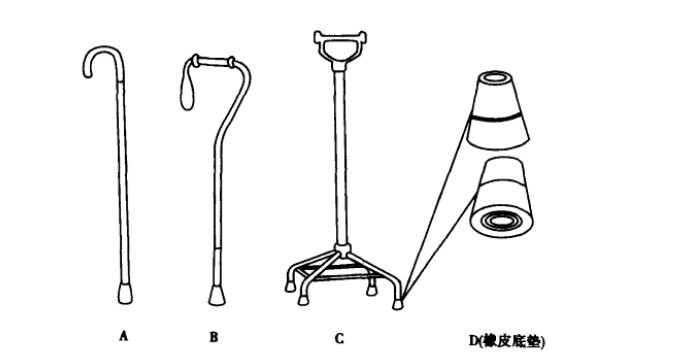 (2)手杖的种类:①根据材质:手杖可分为木制或金属制。术制手杖长短是同定的,不能调整,金属制手杖可依身高来调整。②根据手杖底端的形状:可为单脚和四脚型。见图5-2。其中A和B型:属于标准型手杖,B型适用于手无法握有曲度把手者。C型:具有四脚,比单脚型的支撑力和支撑面大所以稳定性更大。常用于步态极为不稳定或地面较不平的时候。