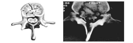 2.腰椎CT示T11椎体爆裂骨折,椎管内占位性病变。诊断为T11椎体爆裂骨折并脊髓损伤。