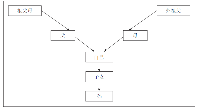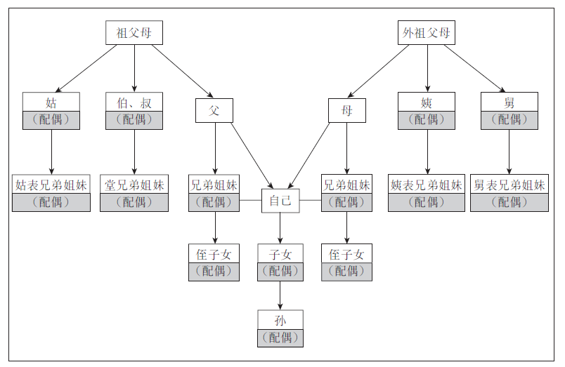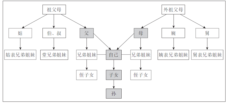 三代以内旁系血亲指同源于祖父母、外祖父母的三代以内,除父母直系血亲以外的,与自己有间接血亲关系的亲属。如图所示(阴影部分为直系血亲,非阴影部分为三代以内旁系血亲)。