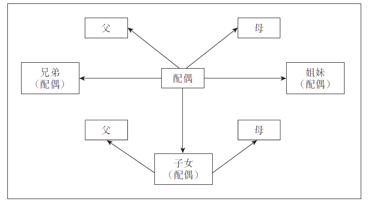 近姻亲关系是指以婚姻关系为中介而产生的亲属关系,近姻亲主要指配偶的父母、配偶的兄弟姐妹及其配偶、子女的配偶及子女配偶的父母以及三代以内旁系血亲的配偶。如图所示。
